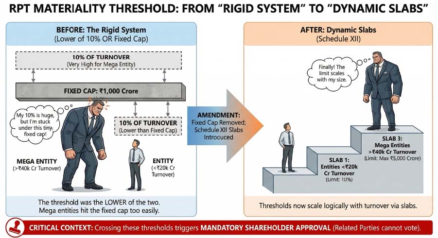 Large corporations no longer hit the uniform cap of fixed INR1,000 crore ceiling. Their threshold now scales logically with their size (up to INR5,000 crore), reducing the need for constant shareholder votes on routine operational matters. For entities with less than INR20,000 crore turnover, the rule effectively remains the same (10% of annual consolidated turnover).